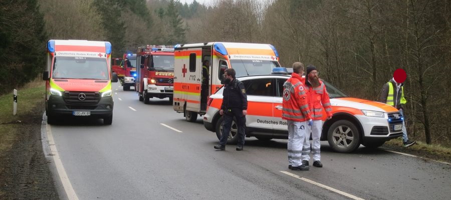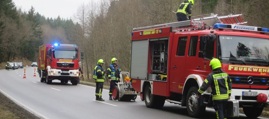 Zu einem Verkehrsunfall auf der B 257 zwischen Daun und Darscheid wurde die Feuerwehr Daun am 12.02.2023 um 12.06 Uhr alarmiert. Laut Meldung bei Alarmierung befanden sich noch zwei verletzte Personen im Fahrzeug, weshalb unverzüglich KdoW, VRW, HLF und MZF zur Einsatzstelle ausrückten.