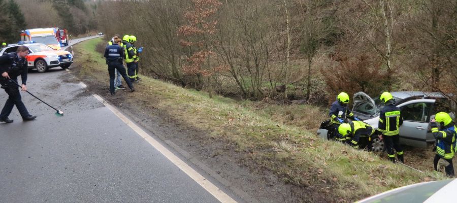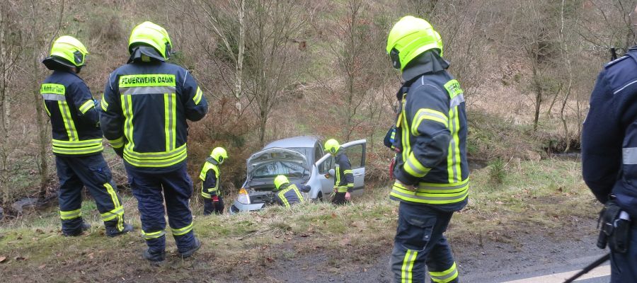 Beim Eintreffen der Feuerwehr Daun an der Unfallstelle befand sich keine Person mehr im Fahrzeug. Die Fahrzeuginsassen wurden bereits vom Rettungsdienst betreut.