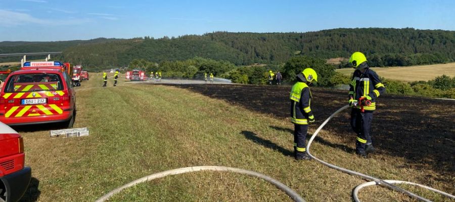 Beim Eintreffen der Feuerwehr Daun hatte die Feuerwehr Rengen das Feuer bereits mit Feuerpatschen unter Kontrolle. Schnell wurde von der Feuerwehr Waldkönigen eine Wasserversorgung von einem naheliegenden Hydranten zum Dauner Tanklöschfahrzeug TLF aufgebaut. So konnte, nachdem der 2.400 Liter Wassertank des TLF leer war, sofort weitergelöscht werden.