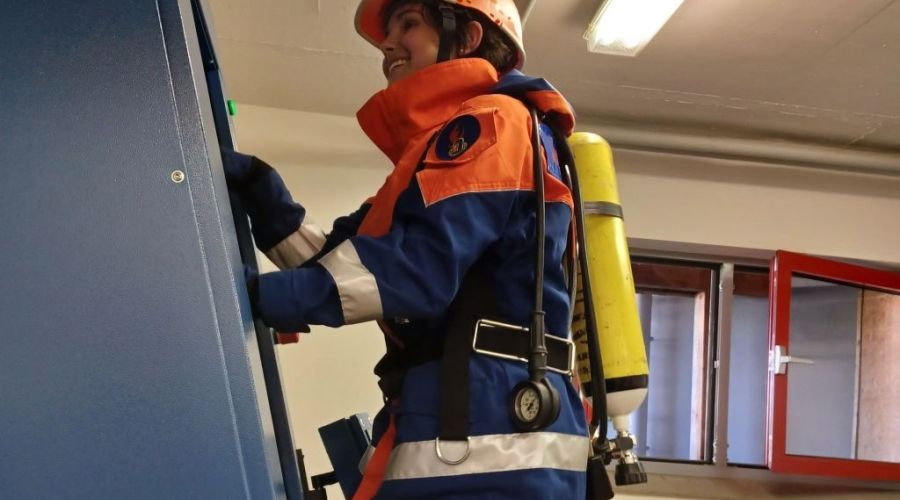 Des Weiteren konnten die Jugendfeuerwehrangehörigen auf der Atemschutzübungsstrecke hautnah erleben, wie anstrengend die jährliche Tauglichkeitsüberprüfung von Atemschutzgeräteträgern ist. Im Fitnessraum galt es das Laufband und die Endlosleiter zu bezwingen und sich auf der Atemschutzübungsstrecke im Trupp kriechend fortzubewegen. Zudem wurde die Funktionsweise des Atemschutzgerätes sowie der Schutzkleidung erklärt.
