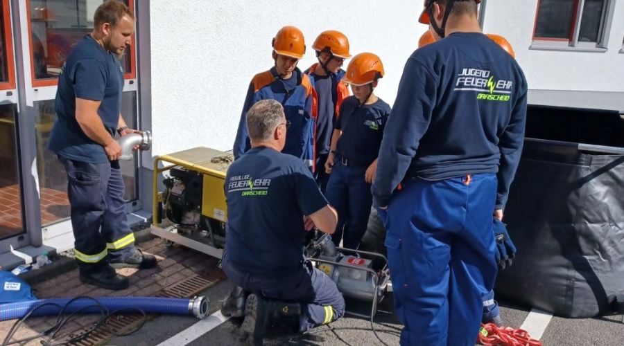 Eine weitere Station befasste sich mit dem Thema Schmutzwasserpumpe. Dazu wurde ein mit Wasser gefüllter Faltbehälter als vollgelaufener Keller angenommen. Hier konnten die Einsatzmöglichkeiten und die Funktionsweise der Schmutzwasserpumpe erklärt werden. Zudem lernten die Jugendlichen die Bedienung des Stromerzeugers sowie eines Schutzschalters für das Hausnetz kennen, um die Pumpe mit Strom zu versorgen.