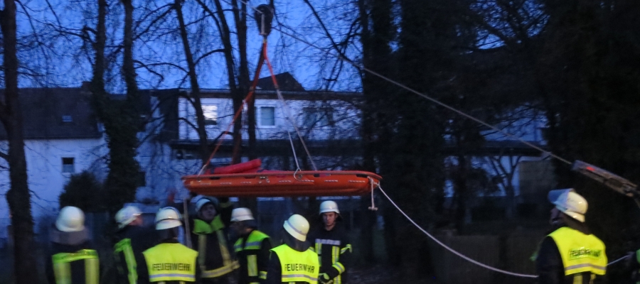 Eine zweite Gruppe übte das Retten von Personen aus Höhen unter Zuhilfenahme des Greifzuges. Mit diesem wurde ein Seil zwischen dem Schlauchtrockenturm am Feuerwehrhaus und einem Fahrzeug als Fixpunkt gespannt. Anstatt des Fahrzeuges könnte auch der Erdanker verwendet werden, so dass diese Methode in jedem Gelände eingesetzt werden kann.