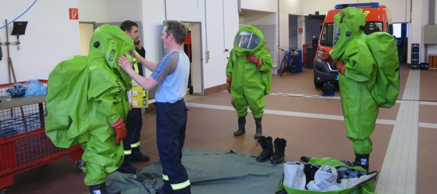 Jeder ausgebildete Träger von Chemikalienschutzanzügen muss einmal im Jahr eine Belastungsübung mit diesem Anzug durchführen. Zuerst muss der Anzug vorbereitet werden. Während der Träger des Anzuges den umluftunabhängigen Pressluftatmer anzieht, bereiten die Helfer den Anzug zum zügigen Anziehen vor.